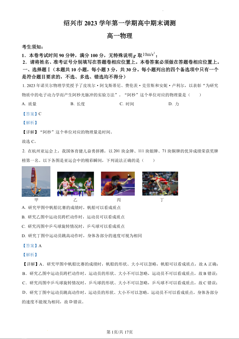 浙江省绍兴市2023学年第一学期高中期末调测物理(精品解析版)