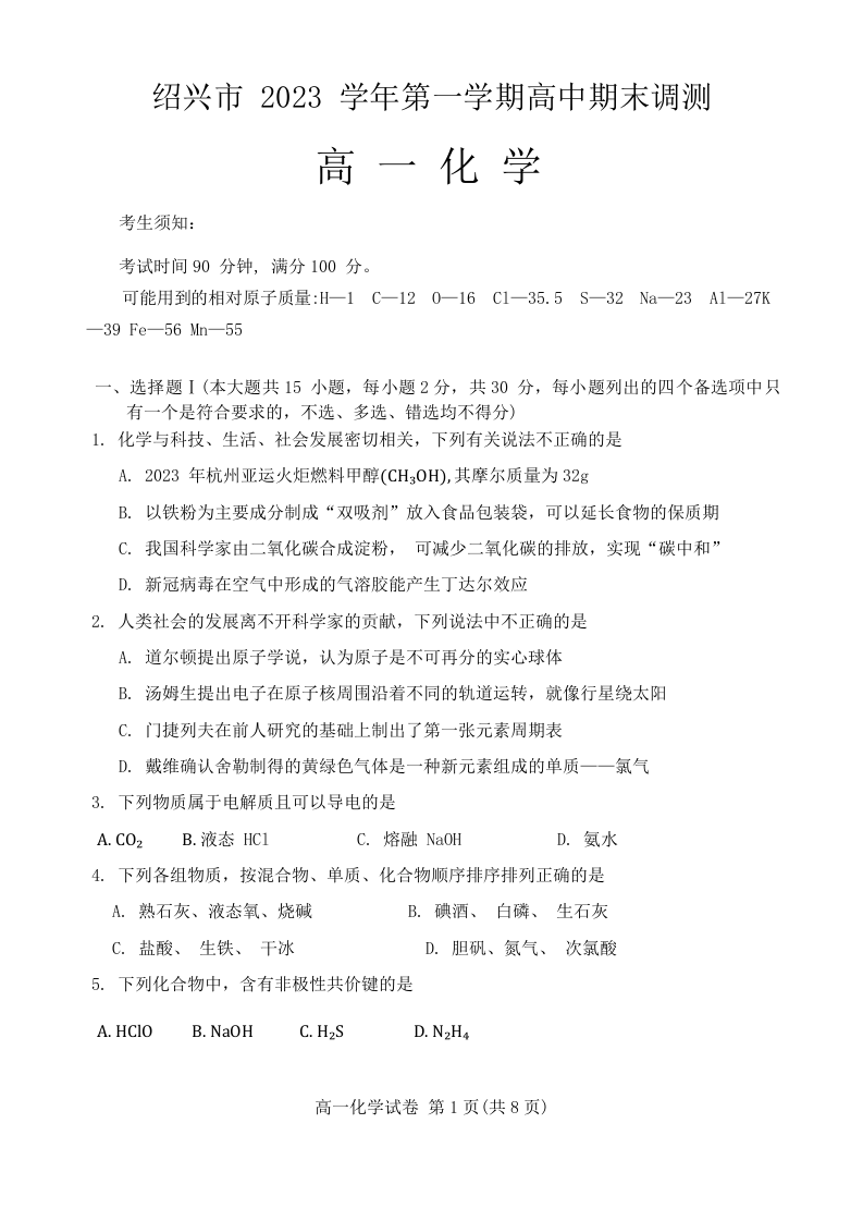 浙江省绍兴市2023学年第一学期高中期末调测化学