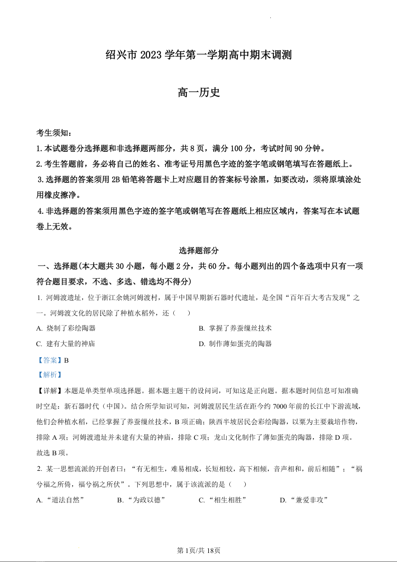 浙江省绍兴市2023学年第一学期高中期末调测历史(精品解析版)