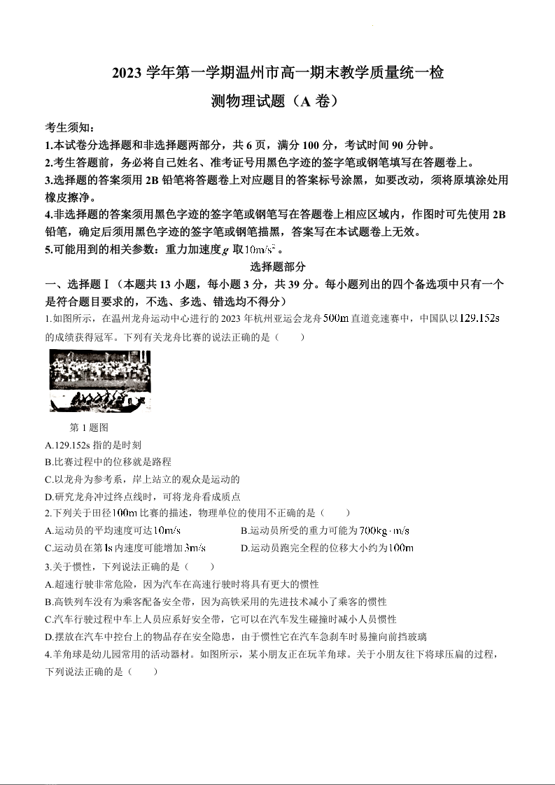浙江省温州市2023学年第一学期高一期末教学质量统一检测物理+答案