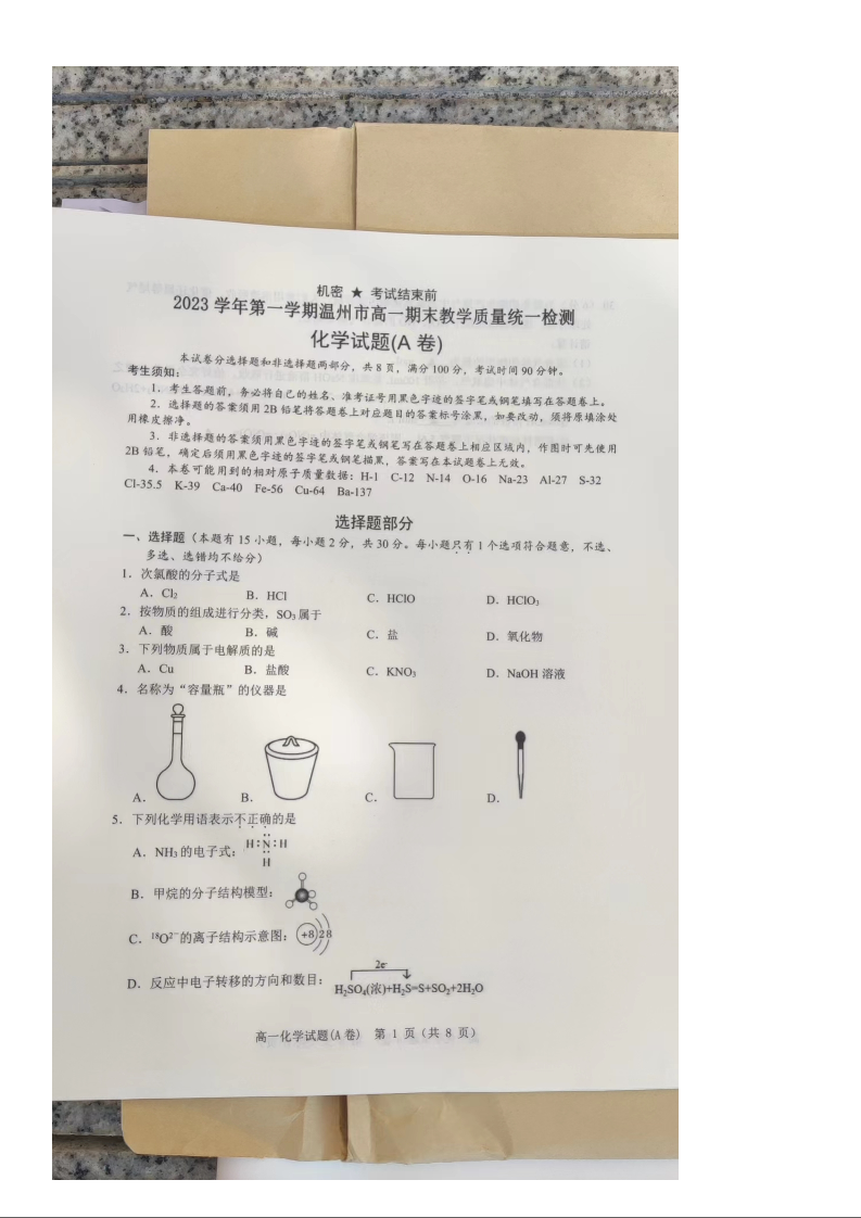 浙江省温州市2023学年第一学期高一期末教学质量统一检测化学+答案