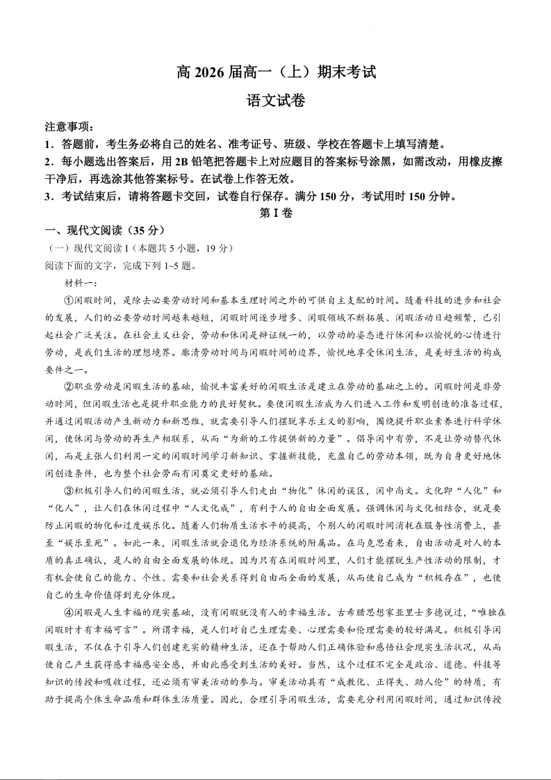 重庆市巴蜀中学2023-2024学年高一(上)期末考试语文
