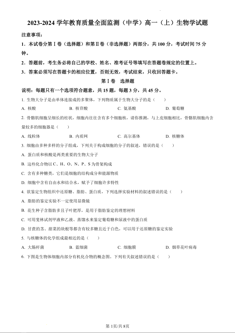 重庆市九龙坡区2023-2024学年教育质量全面监测生物(原卷版)