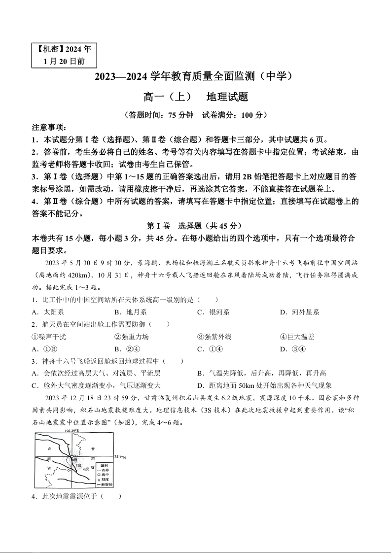 重庆市九龙坡区2023-2024学年教育质量全面监测地理