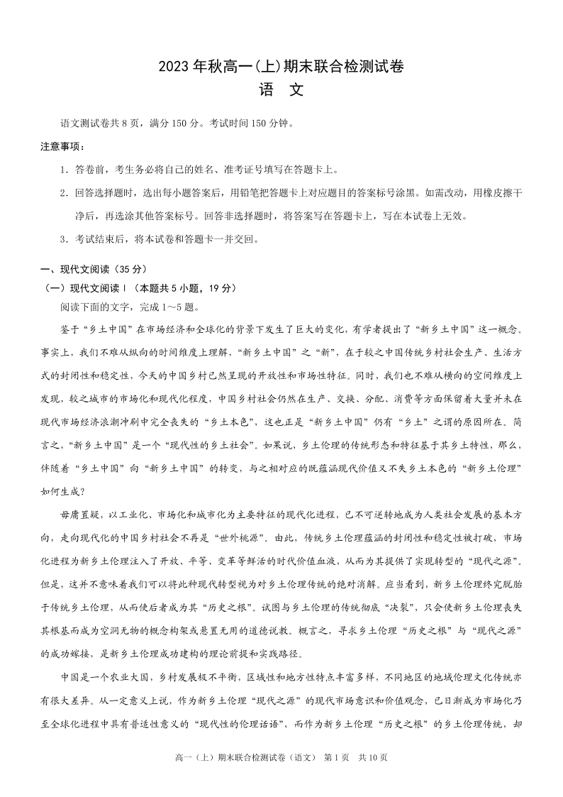 重庆市康德卷 2023 年秋高一(上)期末联合检测语文