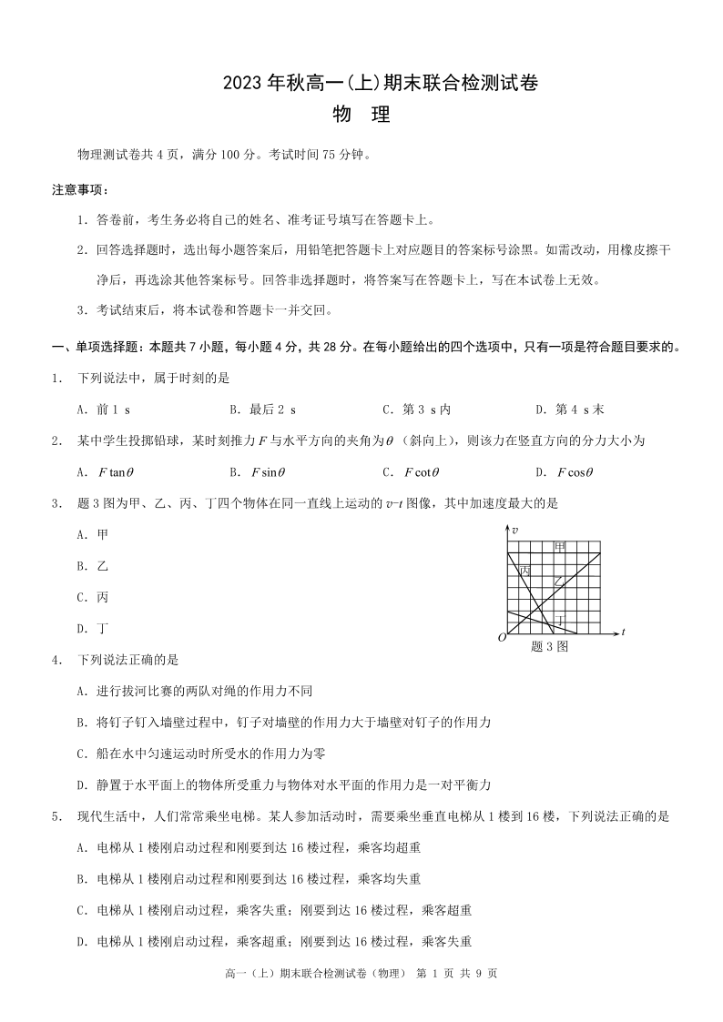 重庆市康德卷 2023 年秋高一(上)期末联合检测物理+答案