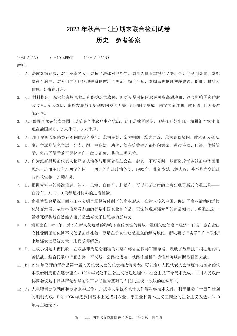 重庆市康德卷 2023 年秋高一(上)期末联合检测历史答案