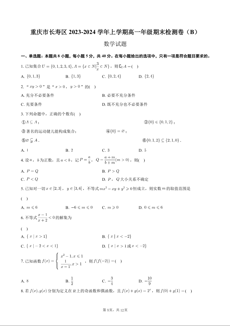 重庆市长寿区2023-2024学年上学期高一年级期末检测卷数学+答案