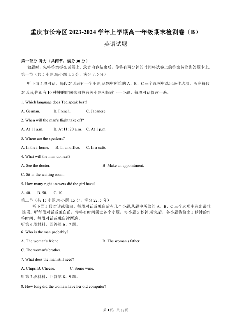 重庆市长寿区2023-2024学年上学期高一年级期末检测卷英语+答案