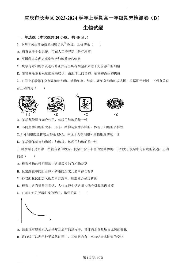 重庆市长寿区2023-2024学年上学期高一年级期末检测卷生物(原卷版)