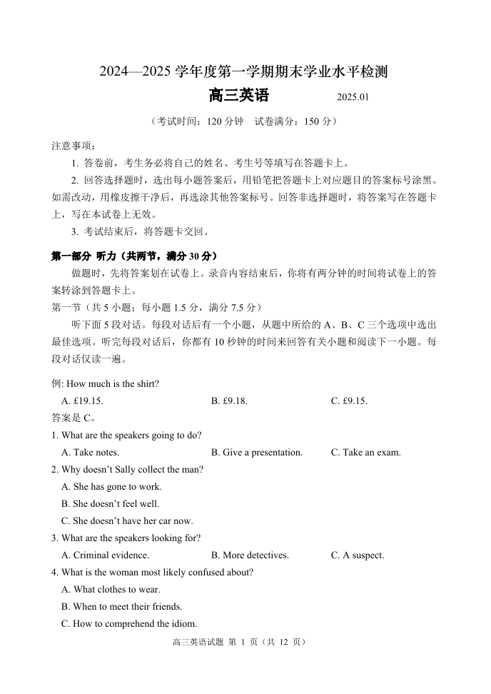 山东省青岛市2024-2025学年度第一学期高三期末学业水平检测英语