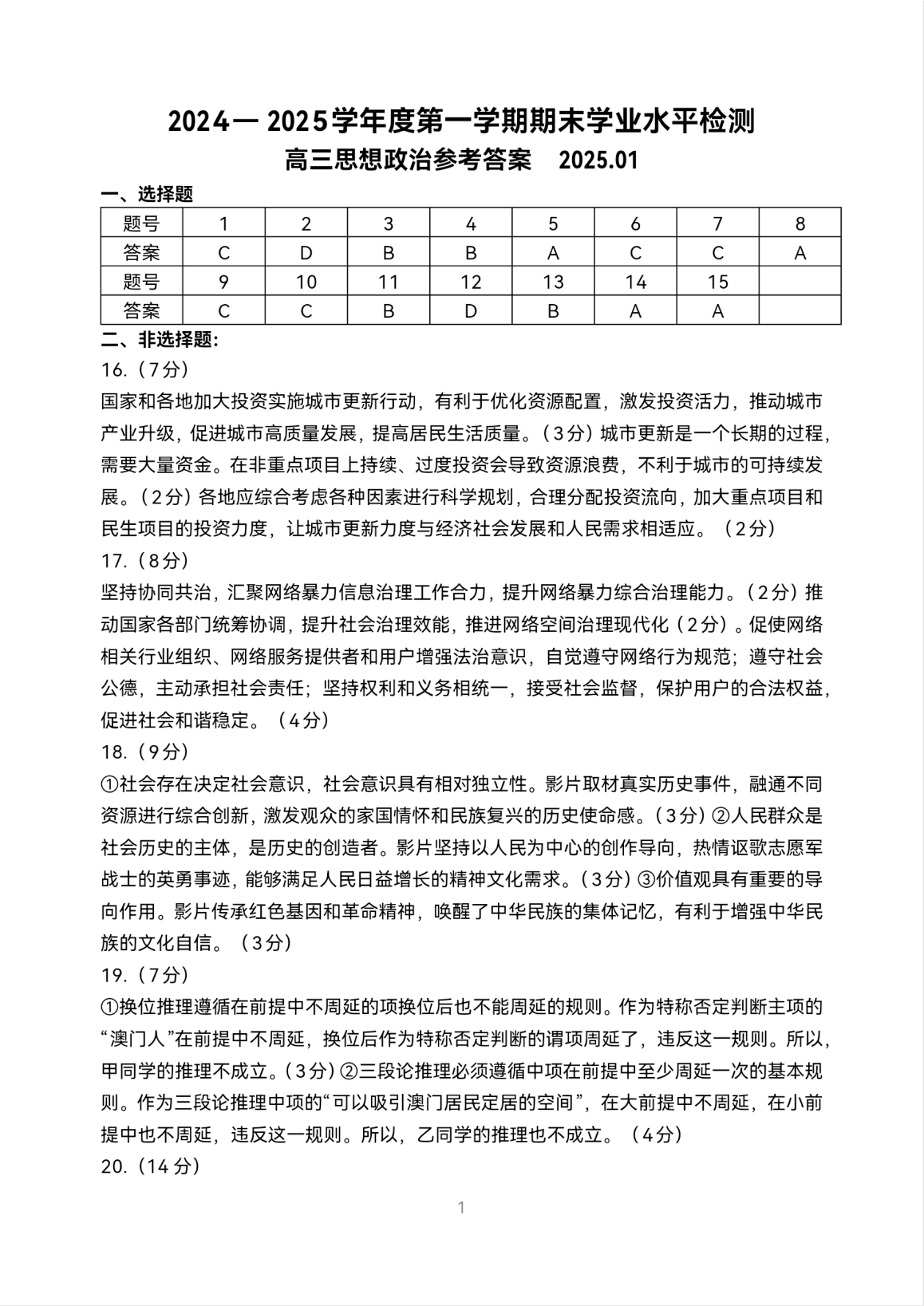 山东省青岛市2024-2025学年度第一学期高三期末学业水平检测政治答案