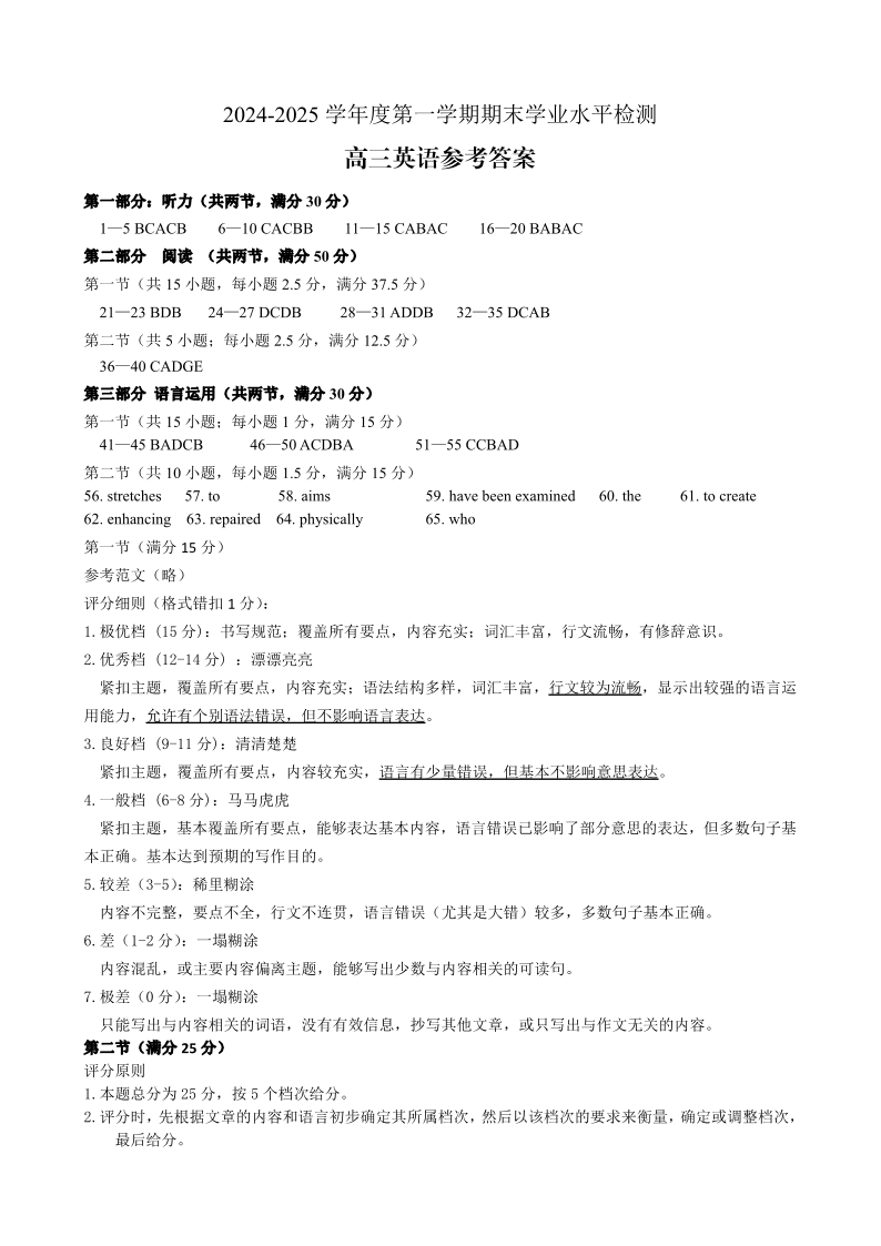 山东省青岛市2024-2025学年度第一学期高三期末学业水平检测英语答案