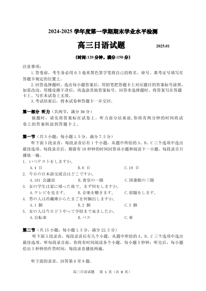 山东省青岛市2024-2025学年度第一学期高三期末学业水平检测日语