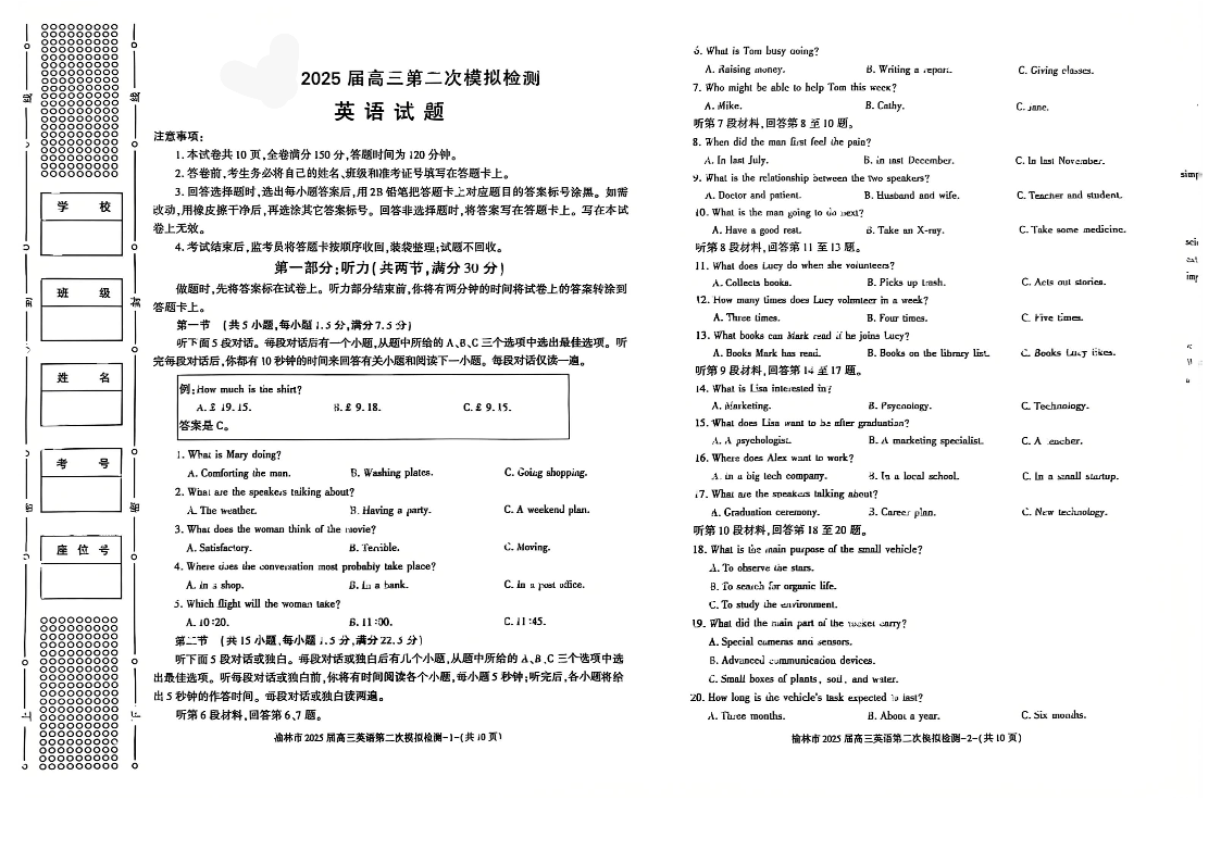 陕西省榆林市2025届高三1月第二次模拟检测(二模)英语+答案