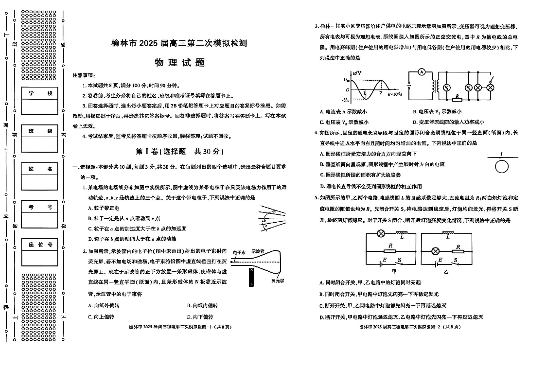 陕西省榆林市2025届高三1月第二次模拟检测(二模)物理+答案