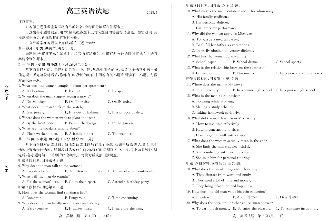 山东省德州市2024-2025学年上学期1月高三期末考试英语
