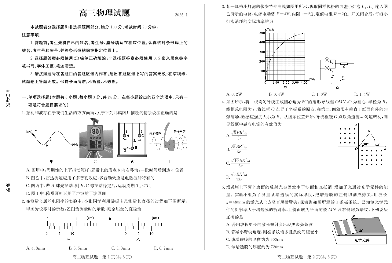 山东省德州市2024-2025学年上学期1月高三期末考试物理