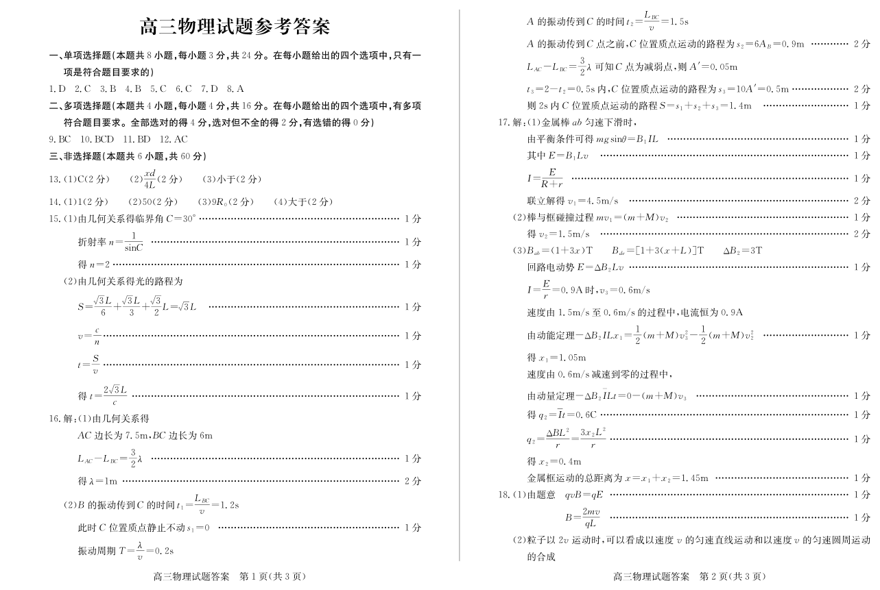 山东省德州市2024-2025学年上学期1月高三期末考试物理答案