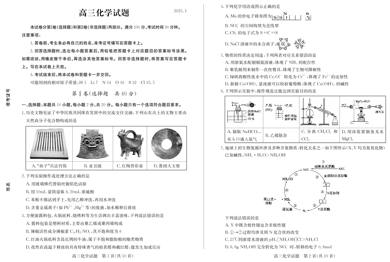 山东省德州市2024-2025学年上学期1月高三期末考试化学