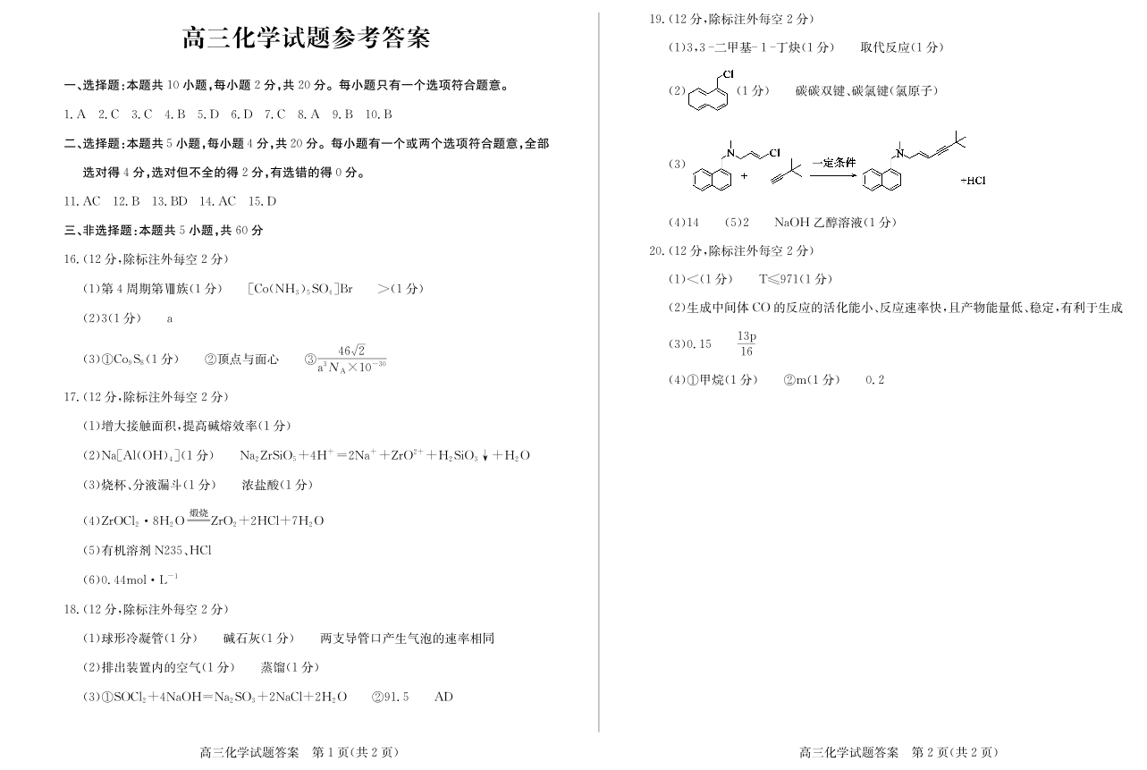 山东省德州市2024-2025学年上学期1月高三期末考试化学答案