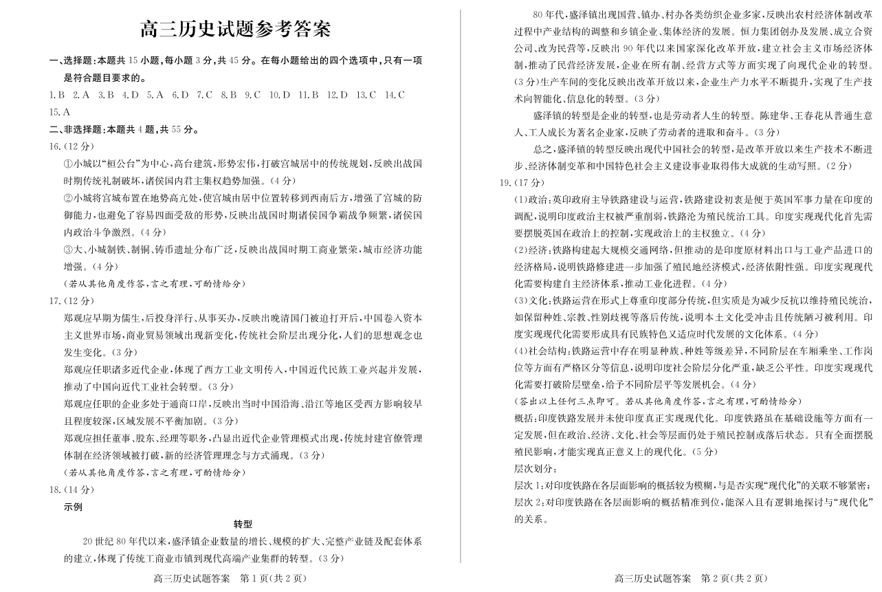 山东省德州市2024-2025学年上学期1月高三期末考试历史答案