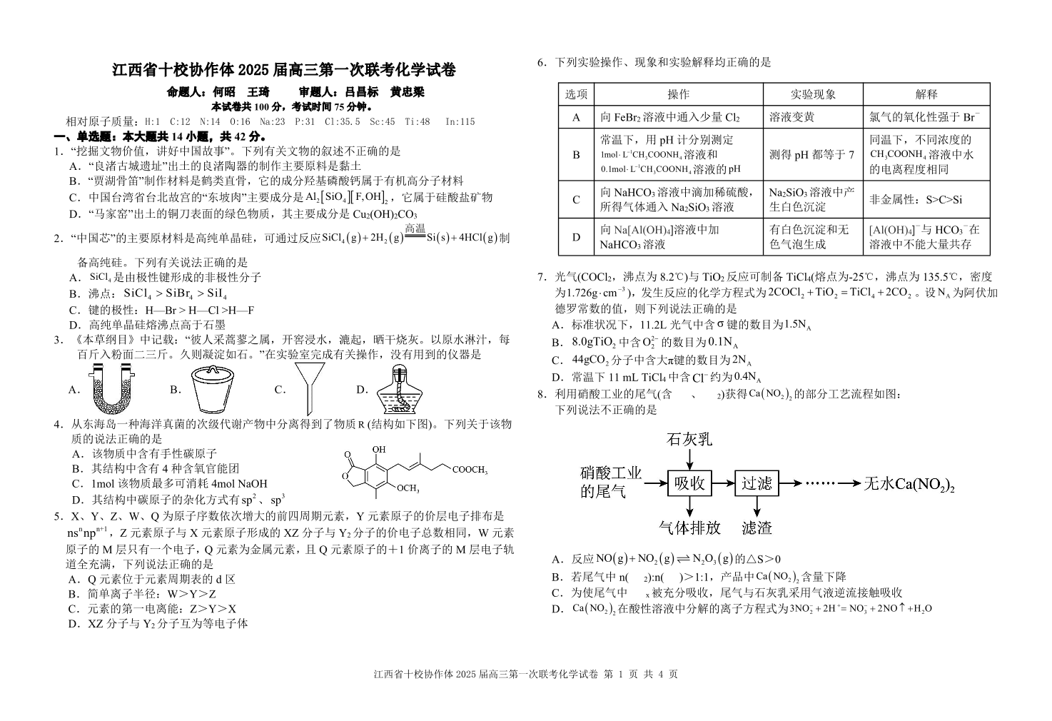 江西五市十校联考暨十校协作体2025届高三第一次联考化学