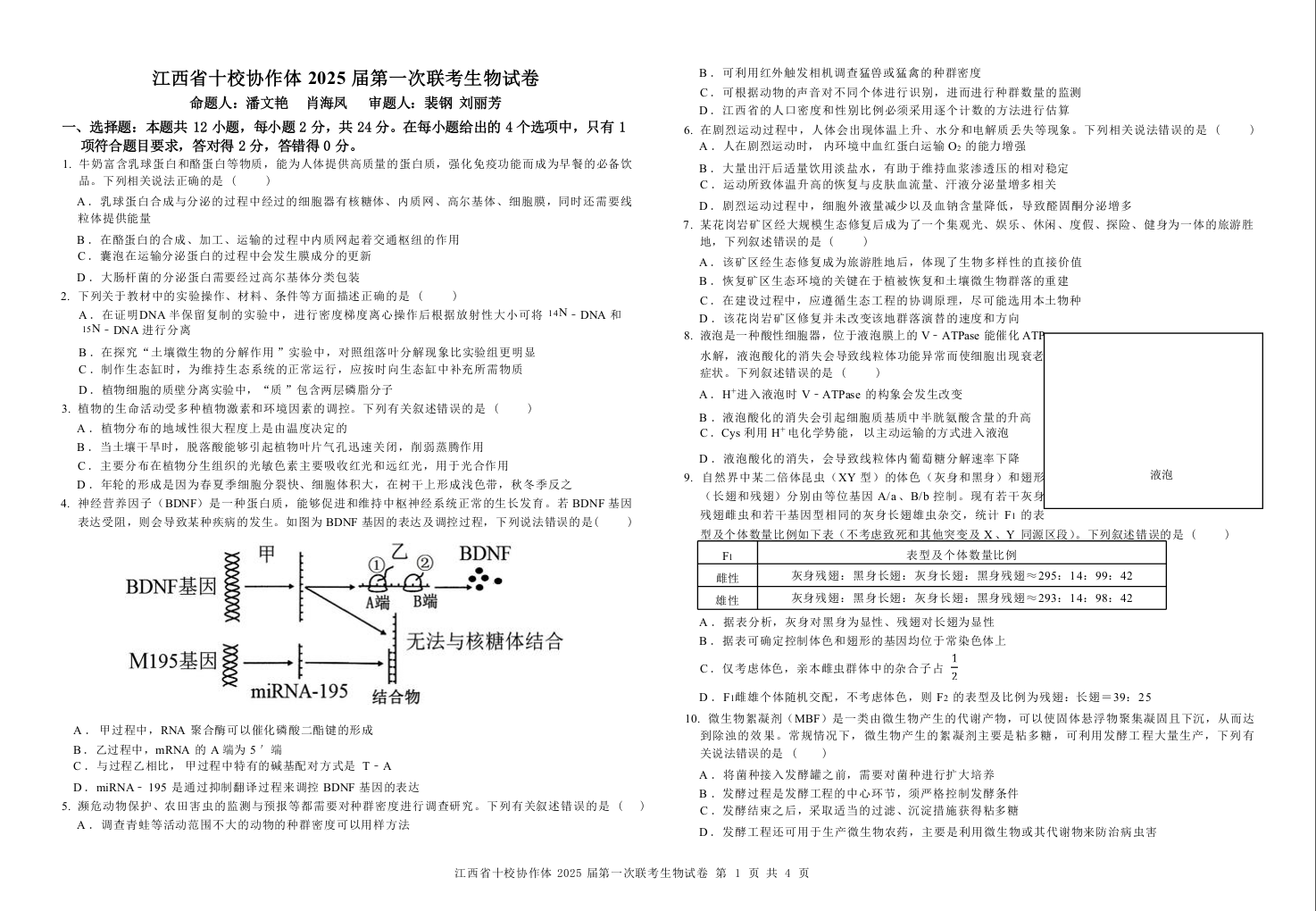 江西五市十校联考暨十校协作体2025届高三第一次联考生物