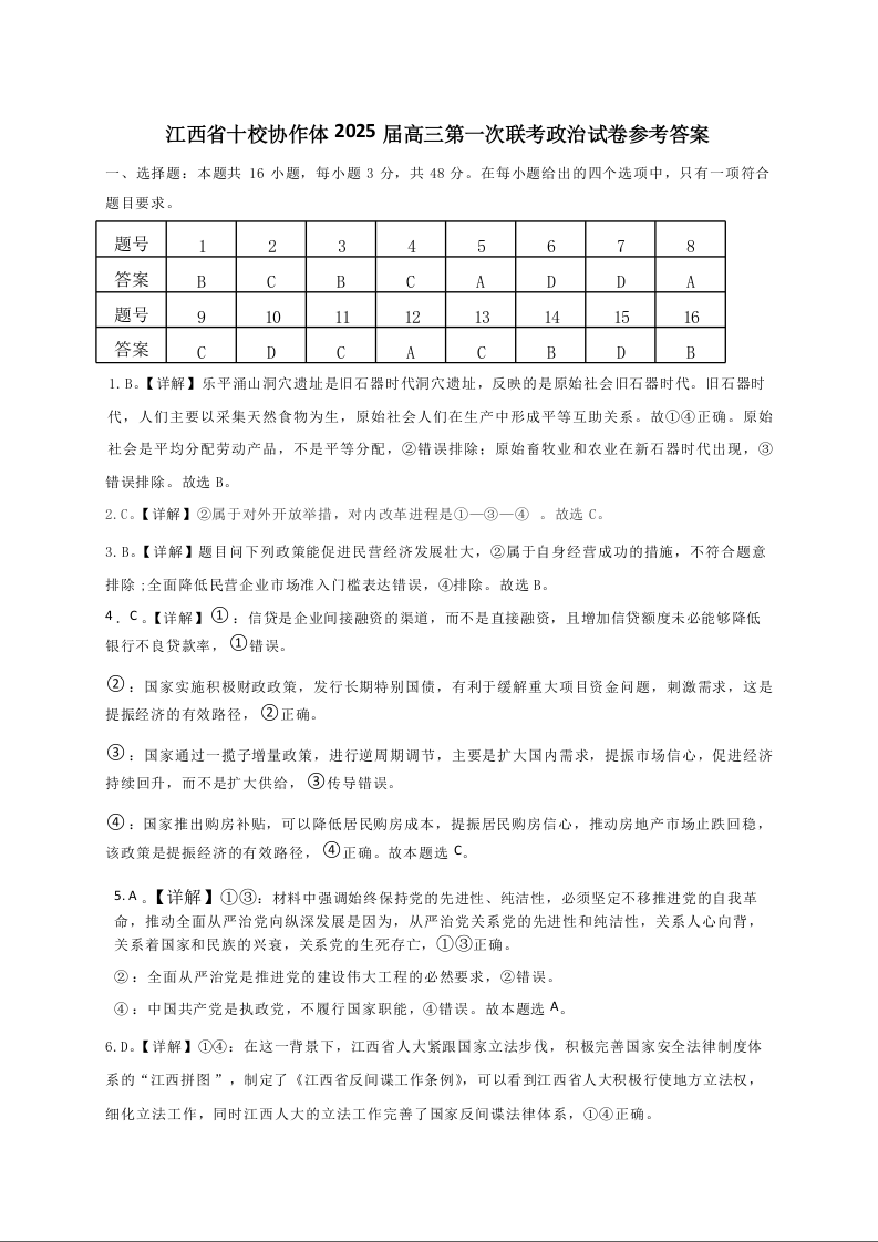 江西五市十校联考暨十校协作体2025届高三第一次联考政治答案