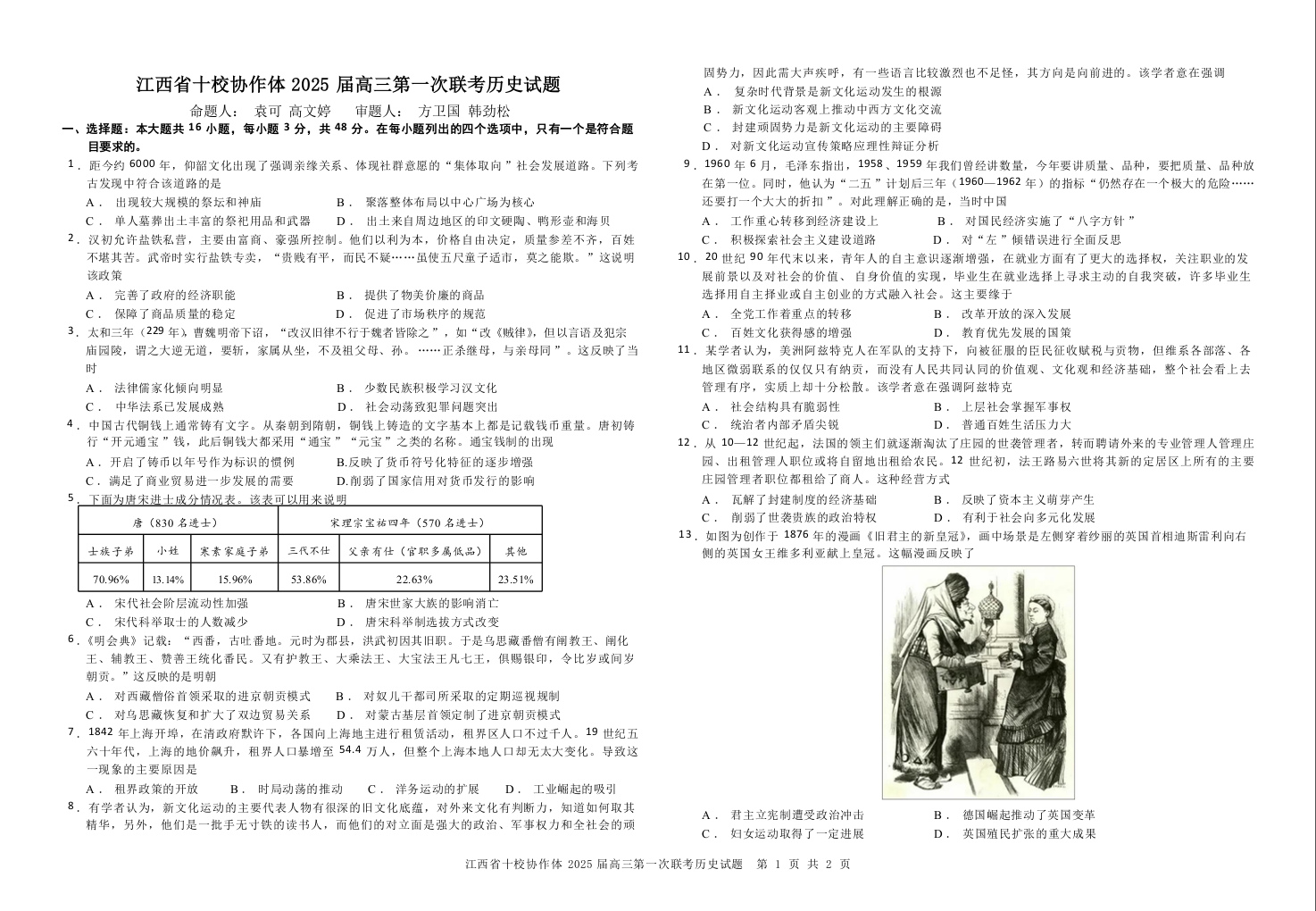 江西五市十校联考暨十校协作体2025届高三第一次联考历史