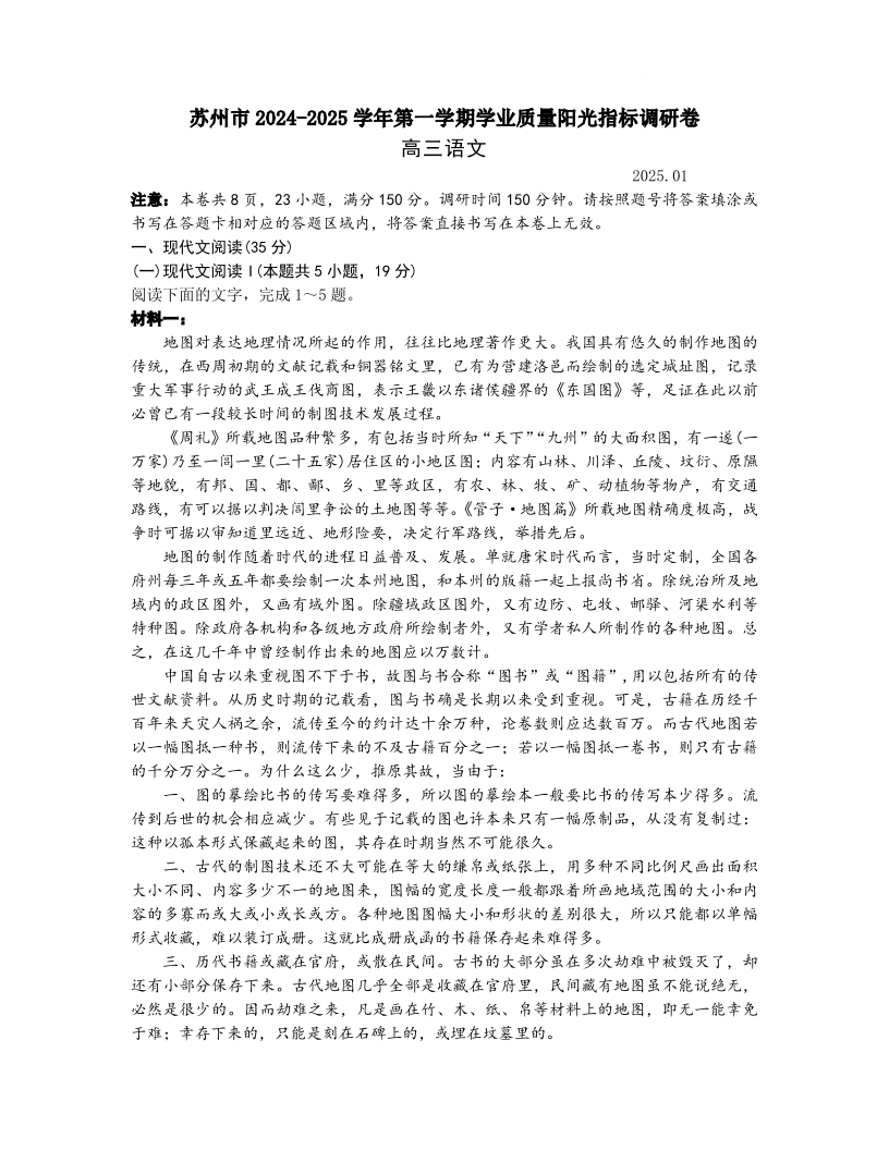 江苏省苏州市2024-2025学年上学期1月高三期末考试语文+答案