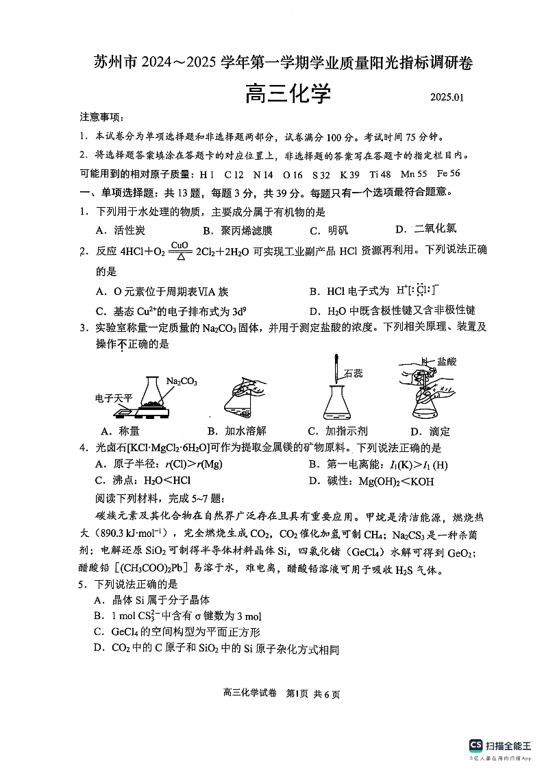 江苏省苏州市2024-2025学年上学期1月高三期末考试化学
