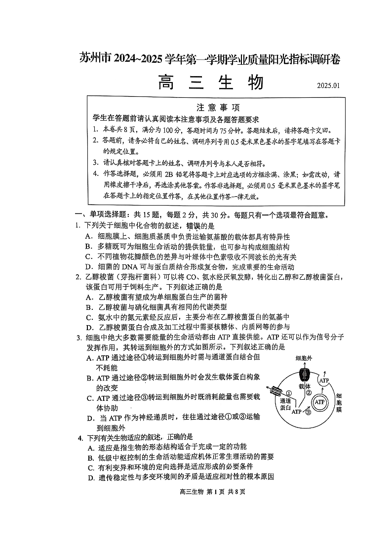 江苏省苏州市2024-2025学年上学期1月高三期末考试生物