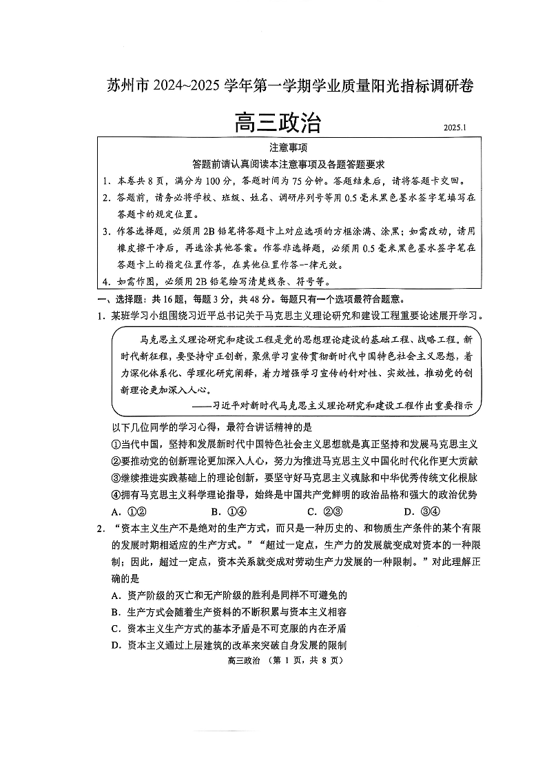 江苏省苏州市2024-2025学年上学期1月高三期末考试政治