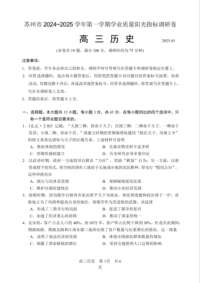 江苏省苏州市2024-2025学年上学期1月高三期末考试历史