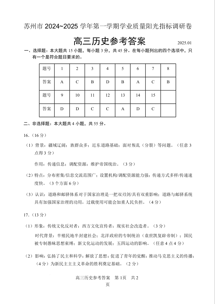 江苏省苏州市2024-2025学年上学期1月高三期末考试历史答案