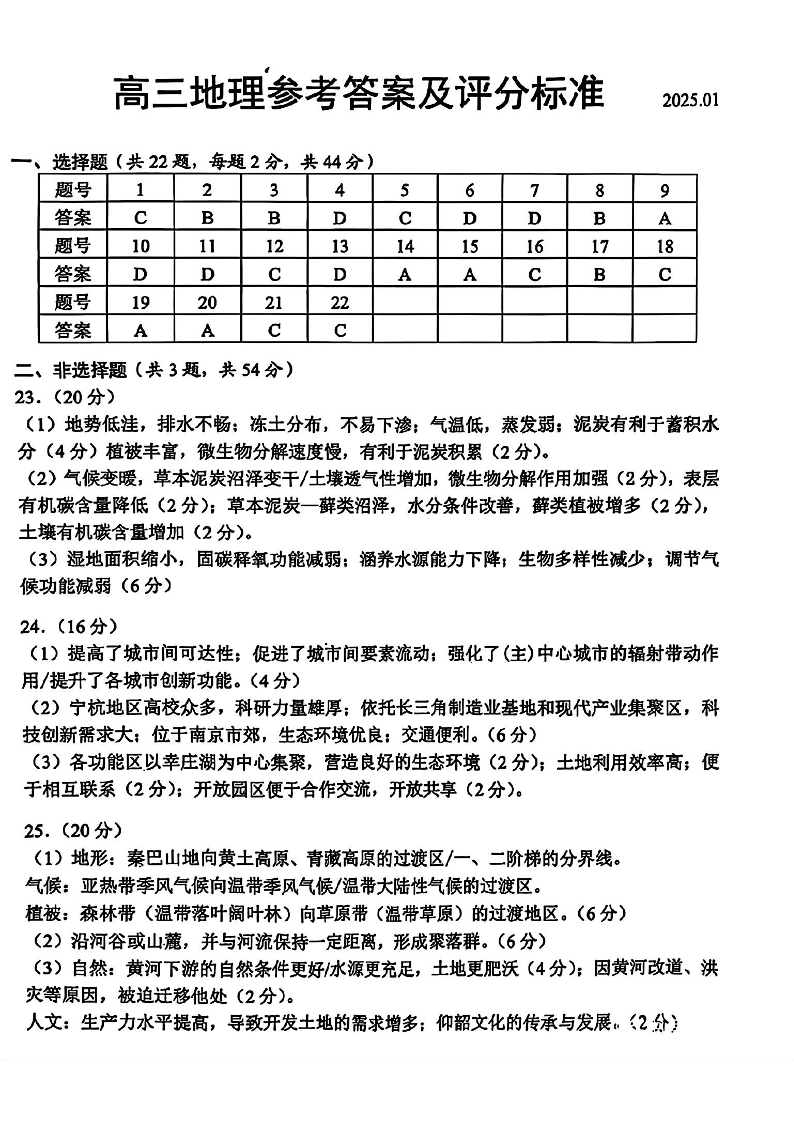 江苏省苏州市2024-2025学年上学期1月高三期末考试地理答案
