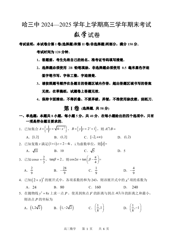 黑龙江省哈尔滨市第三中学2025届高三上学期1月期末考试数学