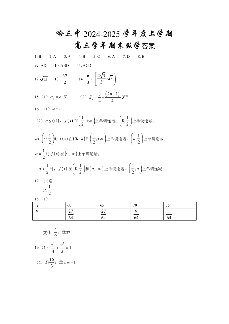 黑龙江省哈尔滨市第三中学2025届高三上学期1月期末考试数学答案