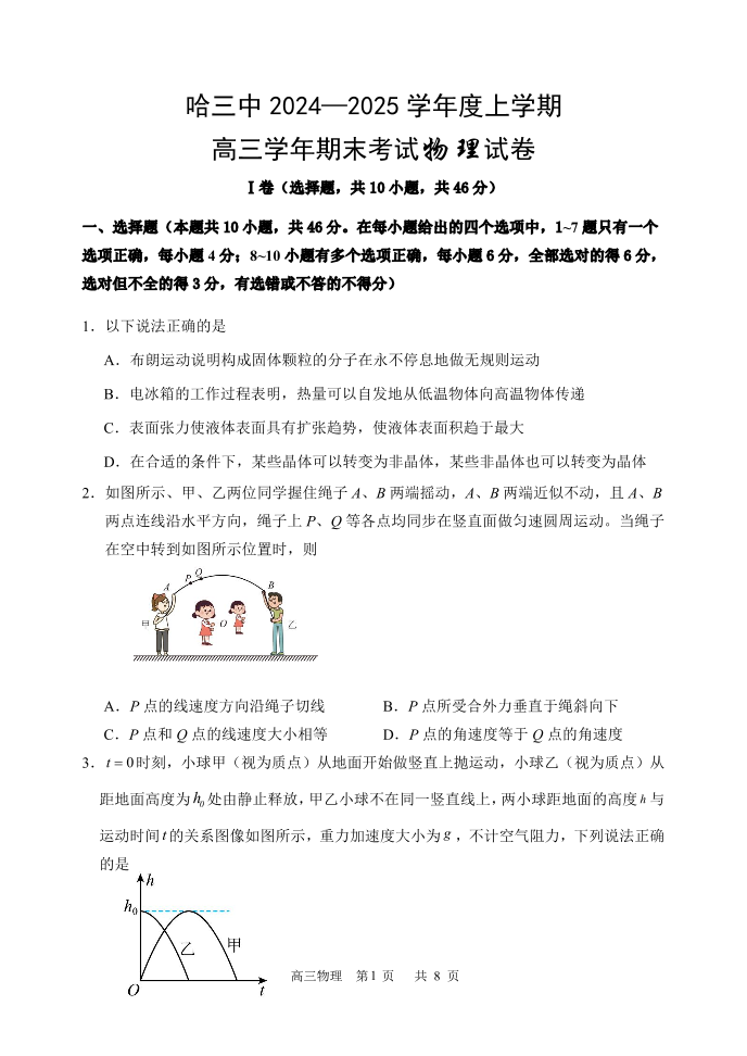 黑龙江省哈尔滨市第三中学2025届高三上学期1月期末考试物理