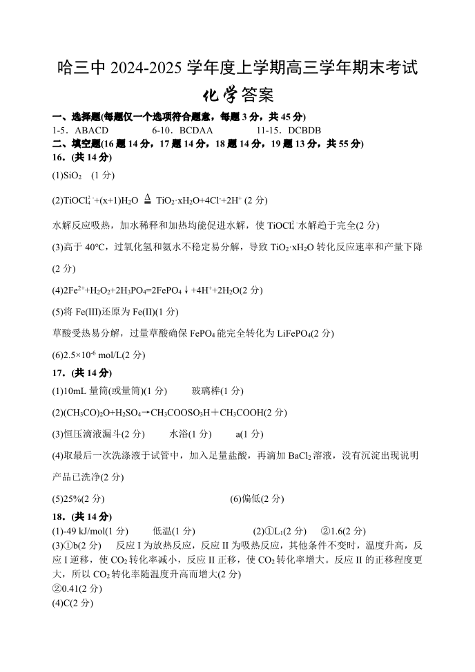 黑龙江省哈尔滨市第三中学2025届高三上学期1月期末考试化学答案