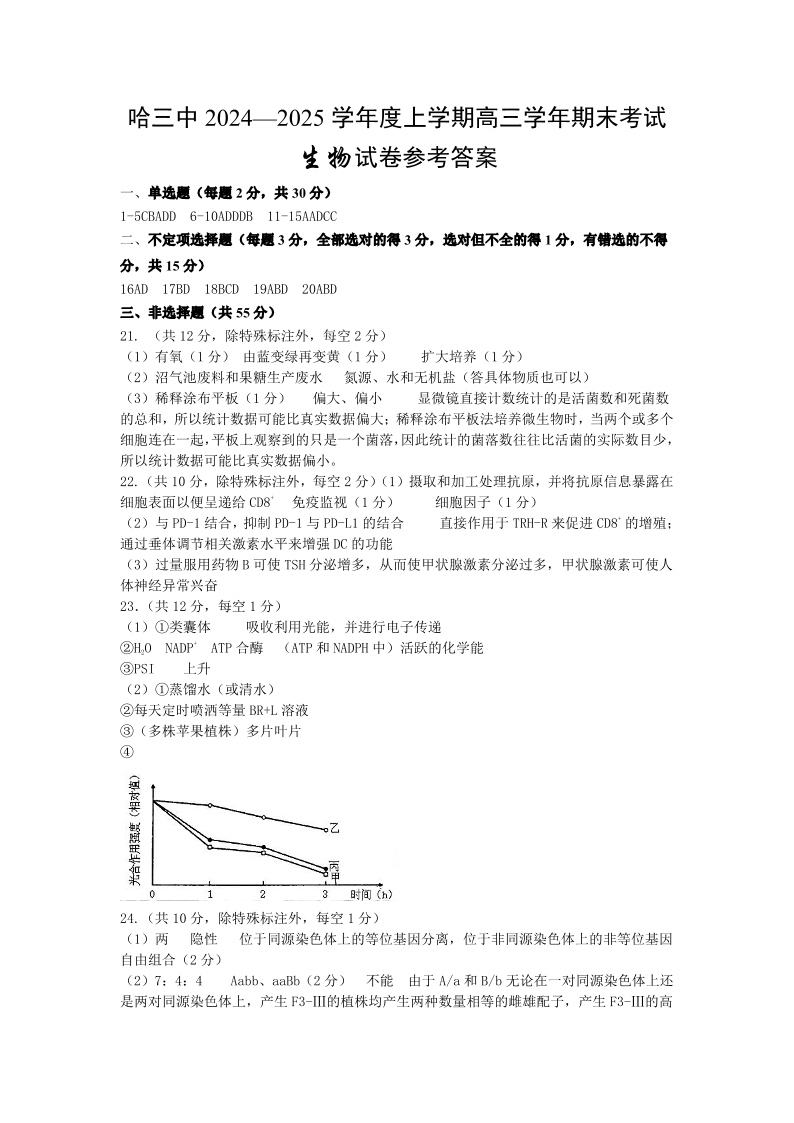 黑龙江省哈尔滨市第三中学2025届高三上学期1月期末考试生物答案