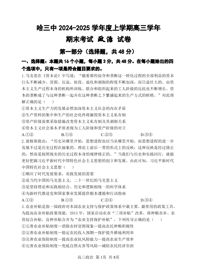 黑龙江省哈尔滨市第三中学2025届高三上学期1月期末考试政治