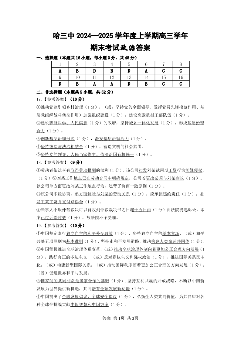 黑龙江省哈尔滨市第三中学2025届高三上学期1月期末考试政治答案