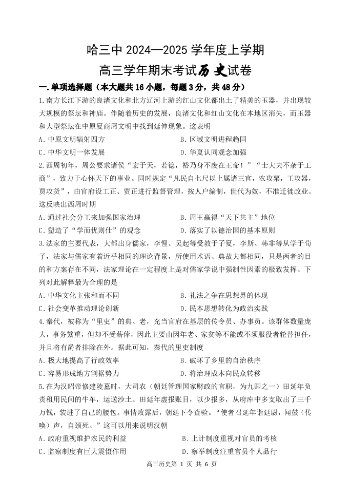黑龙江省哈尔滨市第三中学2025届高三上学期1月期末考试历史