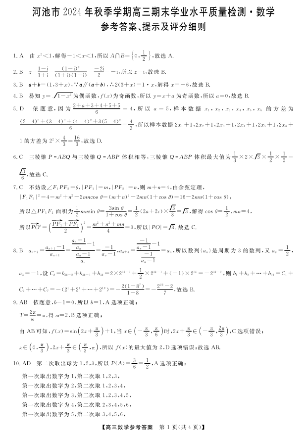 广西省河池市2024-2025学年上学期1月高三期末考试数学答案