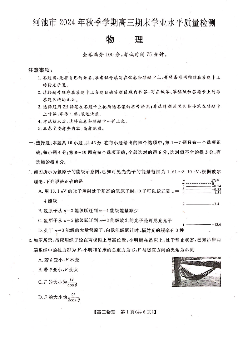 广西省河池市2024-2025学年上学期1月高三期末考试物理