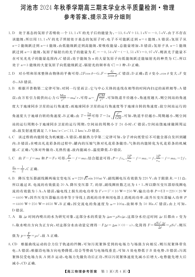 广西省河池市2024-2025学年上学期1月高三期末考试物理答案