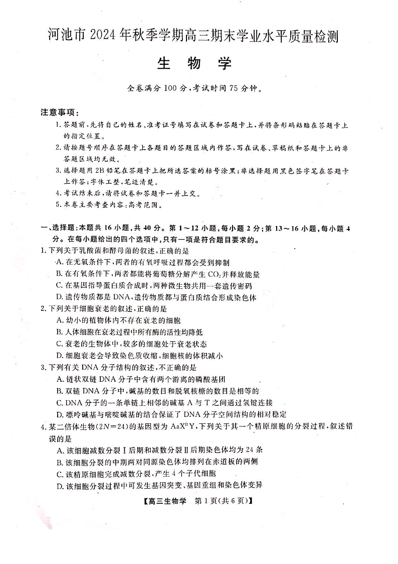 广西省河池市2024-2025学年上学期1月高三期末考试生物