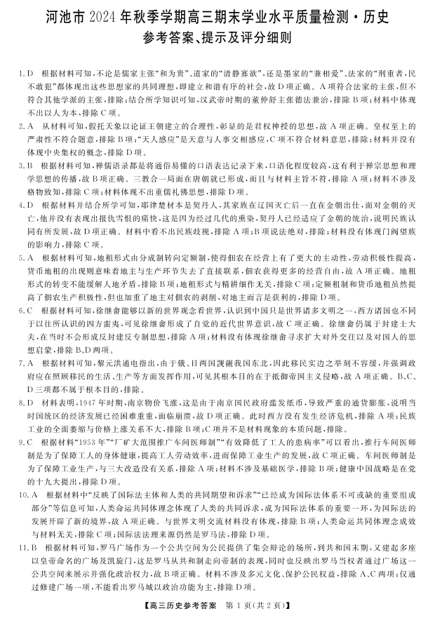 广西省河池市2024-2025学年上学期1月高三期末考试历史答案